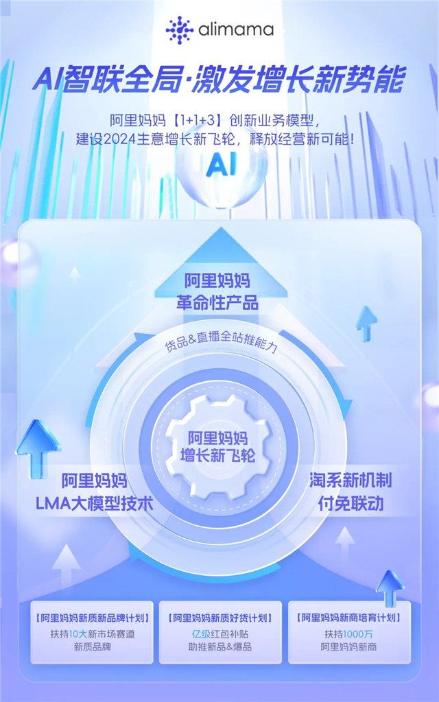 在AI技术重塑商业格局的2024年,新红利时代的大幕已然拉起。本文解读阿里妈妈全新发布的【1+1+3】创新业务模型,通过1个LMA大模型技术+1个革命性新产品+3大商家扶持计划,结合淘系付免联动机制变革,建设2024生意增长新飞轮,释放经营新可能!