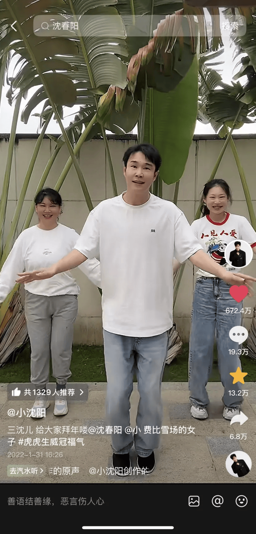 此外,唱歌与跳舞也是他生活里很重要的一部分。他置顶的那条视频,有672万人点了赞:一家三口在东北秧歌的bgm中跳起舞蹈,“三沈儿”洋溢着活泼的笑容,也把一家人的幸福在过年之时传递给无数粉丝。