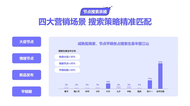 在大促、情绪、新品发布、平销四大典型营销节点,搜索场景呈现独特的流量特征与用户需求,品牌需搭配针对性策略与产品工具组合,实现声量与销量的双重收获。大促节点聚焦“快搜快转”,通过TopView、有刷必映等曝光类产品联动品专,快速建立商品认知,同时借助搜索热榜拉高声量;情绪节点呈现“7日爆发、当天回落”特征,品牌核心可通过星图蓝词、广告加热激发看后搜,并借助品专节点样式承接回流。
