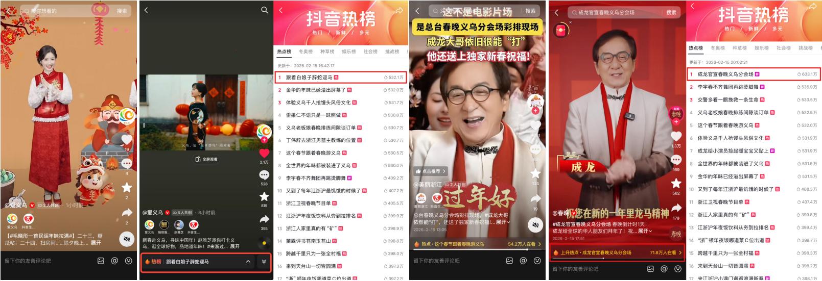 明星的加入则为这种叙事平添了厚度,赵雅芝发起的#跟着白娘子辞蛇迎马 话题,精准唤醒了跨代际的情感共鸣,而毛晓彤的拜年民谣则以清新的形式,为城市赢得了极高的好感度。当春晚的热度席卷全网,#义乌分会场国际范拉满、#这个春节跟着春晚游义乌 话题播放量呈爆发式增长,流量已不再是单纯的数字,而是转化为了本地商家实实在在的经营底气。