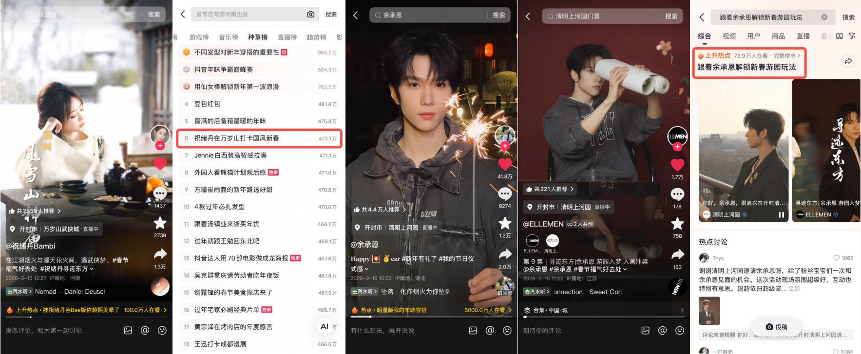 万岁山大宋武侠城与清明上河园里,祝绪丹与余承恩的空降打卡,让#祝绪丹在万岁山打卡国风新春、#跟着余承恩解锁新春游园玩法 等话题在不经意间跨越了时空屏障。明星们以旅人的视角,带领观众走进历史的繁华旧梦,这种极具生命力的影像不仅带来了海量的跨维度曝光,更让这些古老的景区在年轻人心中有了鲜活的性格。
